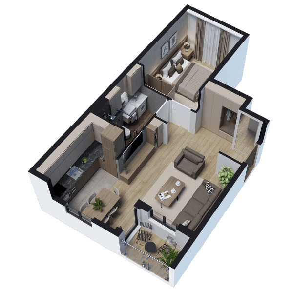 Dvosoban stan na drugom spratu ukupne površine od 45 m2 sa terasom.