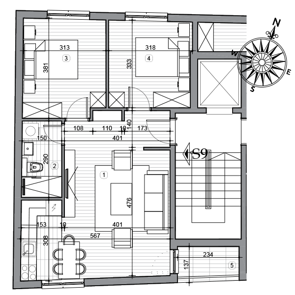 Trosoban stan u potkrovlju ukupne površine od 59.25 m2 sa terasom.